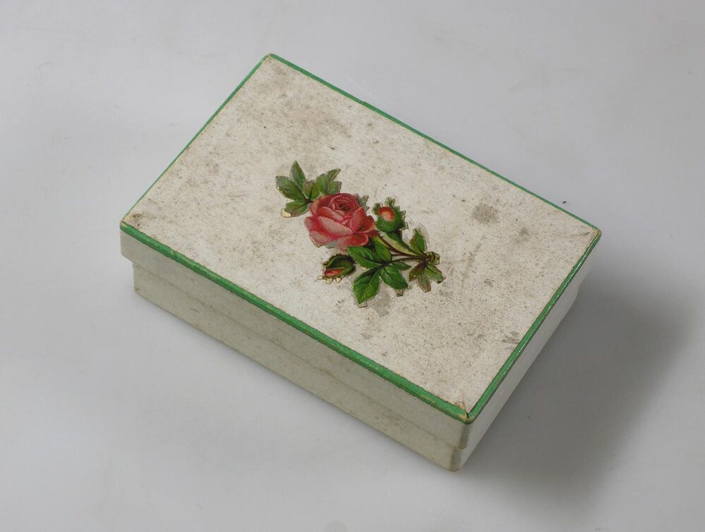 Kartonnen doosje met roosje afgebeeld op deksel. In doosje zitten watten (en broche KA 22159.43).- Trefwoorden