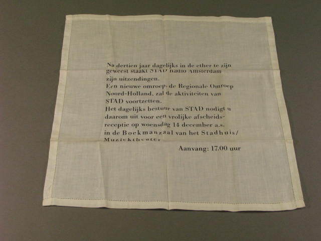 Een grote zakdoek van Radio STAD, al dan niet bedoeld om ook traantjes mee te kunnen deppen. Hierop staat de uitnodiging voor ‘een vrolijke afscheidsreceptie’ vanwege het stoppen van de locale zender eind 1988. Het beleid van de overheid was er toen op gericht dat provincies (of enkele provincies samen) een eigen omroep moesten kunnen krijgen. De provincie Noord-Holland besliste dat er ook een Radio Noord-Holland moest komen. Op 1 januari 1989 ging deze van start. Het merendeel van de medewerkers van Radio STAD maakte niet de overstap naar die nieuwe omroep. Radio STAD heeft 13 jaar bestaan; de eerste uitzending vond plaats precies 35 jaar geleden, op 5 januari 1976.