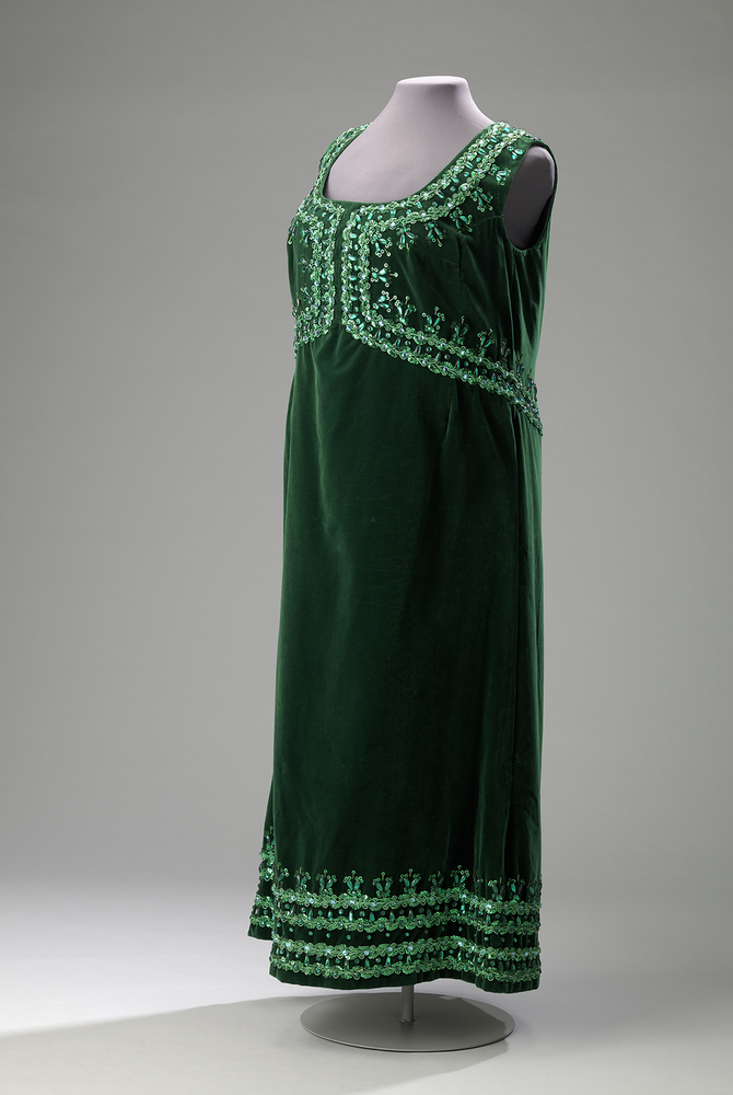Lange avondjurk van groen fluweel, mouwloos, lage ronde hals, met groene glitters. Prinsessenmodel. Lijfje en onderrand van rok is versierd met pailetten, glaskralen en sierband. Gehele jurk is gevoerd met donkergroene voeringzijde. Bij jurk hoort een bijpassend tasje (KA 22335).