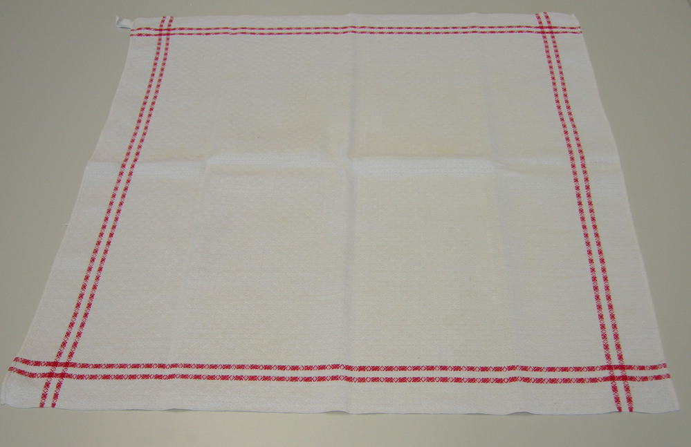 Linnen gastendoek met rode streep langs randen en pellenmotief- Trefwoorden