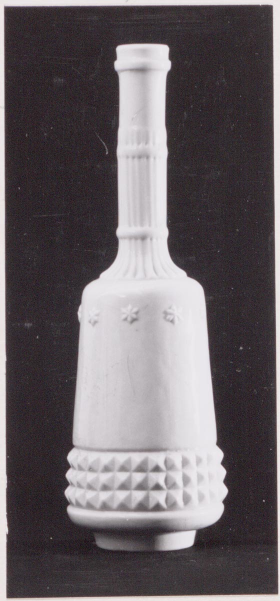 Opaak lichtroze persglas. Ronde smalle standring. Cilindrisch, zich naar boven vernauwend lichaam met smalle hals. Rond onderzijde lichaam in reliëf een band met diamantkoppen. Rondom bovenzijde lichaam in reliëf rozetten. Hals met verticale banden.- Trefwoorden