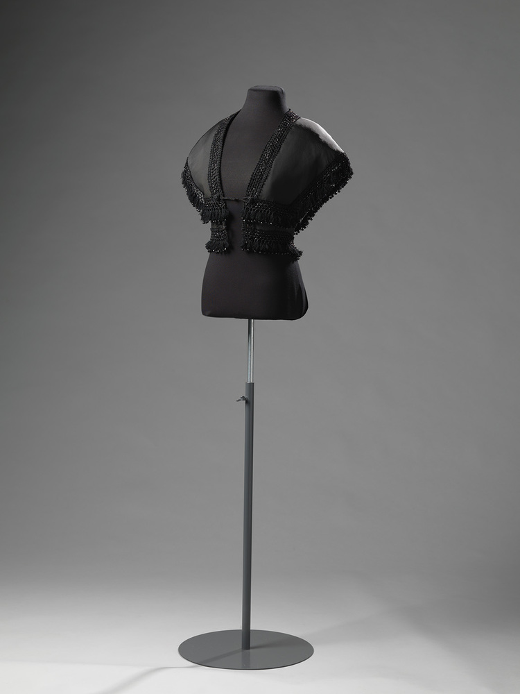 Zwarte bolero van ripszijde met galon van zwarte zijden franje, kwastjes en kraaltjes, sluit van voren met een koord. De stof niet niet hetzelfde als die van het lijfje. De bolero past in de mode rond 1865-1870, en werd over een crinoline japon gedragen.