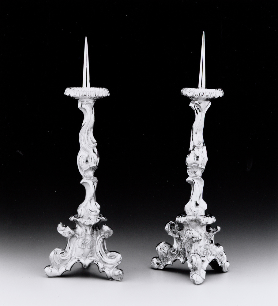 Deze kandelaars zijn een sculpturale variant op het standaardmodel kerkkandelaar zoals dat sedert de zeventiende eeuw gebruikelijk was (cat.nrs. KA 16766, KB 1708). De verschillende onderdelen waaruit een dergelijk type kandelaar is opgebouwd zijn hier als zodanig nauwelijks meer herkenbaar. De maker heeft het object opgevat als één asymmetrische compositie, opgebouwd uit C-voluten, rotsvormen en schuimmotieven. Ook de medaillons in de grillig gevormde voetstukken zijn in de rococo-stijl uitgevoerd.