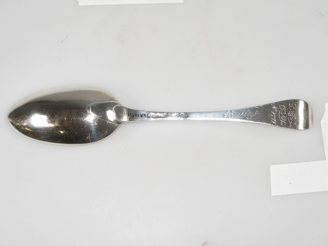 Tafellepel. Steel met middenribbe en omhoog gebogen ronde kop, aan de achterzijde dubbel Amsterdams lof; ovale lepelbak, overwegend puntig. Op onderzijde steel is een monogram gegraveerd met initialen: D.I.A./ O.V.H./, de afkorting van Diaconie Oude Vrouwenhuis, alsmede een naam van diaken of diaconesse en het jaar van aantreden in die functie.