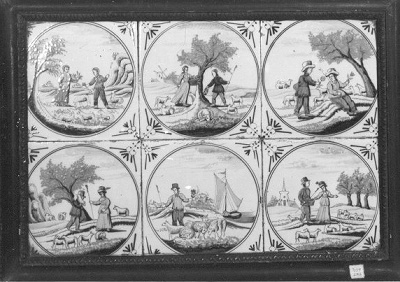 Een tegeltableau is een vlak, bestaande uit meerdere aardewerken tegels, die door een schildering één voorstelling vormen. Tegeltableaus werden vanaf de zeventiende eeuw populair, omdat ze zowel decoratief als functioneel waren. Ze boden uitkomst tegen vocht, waar huisjes langs grachten en kanalen nogal eens last van hadden, en waren gemakkelijk schoon te houden. Daarnaast zorgden de uit Italië afkomstige vormen, kleuren en motieven voor een vrolijke aanblik rond de haard of in de gang. In de periode van de Jugendstil (ca. 1900) leefde de aandacht voor tegeltableaus opnieuw op. Families en bedrijven die het zich konden veroorloven, lieten wanden, gevels en portieken versieren met tegeltableaus in Art Nouveau stijl. Ook voor jubilea en andere feestelijke gelegenheden werden soms tegeltableaus vervaardigd. Een bekende Amsterdamse plateelbakkerij in deze tijd was De Distel (1895-1925), die aan de Valckenierstraat 83-87 gevestigd was. ( Sarah Remmerts de Vries)
