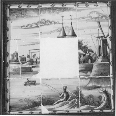 Een tegeltableau is een vlak, bestaande uit meerdere aardewerken tegels, die door een schildering één voorstelling vormen. Tegeltableaus werden vanaf de zeventiende eeuw populair, omdat ze zowel decoratief als functioneel waren. Ze boden uitkomst tegen vocht, waar huisjes langs grachten en kanalen nogal eens last van hadden, en waren gemakkelijk schoon te houden. Daarnaast zorgden de uit Italië afkomstige vormen, kleuren en motieven voor een vrolijke aanblik rond de haard of in de gang. In de periode van de Jugendstil (ca. 1900) leefde de aandacht voor tegeltableaus opnieuw op. Families en bedrijven die het zich konden veroorloven, lieten wanden, gevels en portieken versieren met tegeltableaus in Art Nouveau stijl. Ook voor jubilea en andere feestelijke gelegenheden werden soms tegeltableaus vervaardigd. Een bekende Amsterdamse plateelbakkerij in deze tijd was De Distel (1895-1925), die aan de Valckenierstraat 83-87 gevestigd was. ( Sarah Remmerts de Vries)