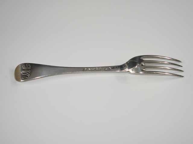 Tafelvork, rechte steel met middenribbe, ronde opstaande kop en dubbel Amsterdams lof. Op onderzijde van steel is een monogram gegraveerd met de initialen: DIACH/, de afkorting van Diaconie Corvershof.