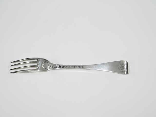 Tafelvork met rechte steel, middenribbe en ronde opstaande kop en dubbel Amsterdams lof. Op onderzijde is een monogram gegraveerd met de initialen: DIACH/, de afkorting van Diaconie Corvershof.