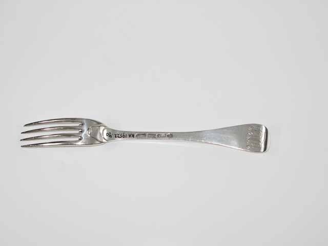 Tafelvork met rechte steel, middenribbe en ronde opstaande kop en dubbel Amsterdams lof. Op onderzijde is een monogram gegraveerd met de initialen: DIACH/, de afkorting van Diaconie Corvershof.