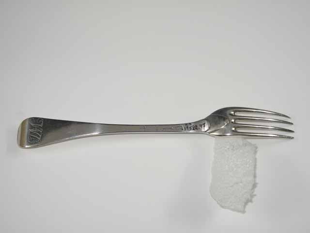 Tafelvork met rechte steel, middenribbe en ronde opstaande kop en dubbel Amsterdams lof. Op onderzijde van steel is een monogram gegraveerd met de initialen: DIACH/, de afkorting van Diaconie Corvershof.