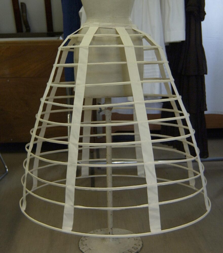 Vanaf begin 1800 wordt het mode om wijde rokken te dragen, die vanaf 1830 worden ondersteund door onderrokken. In 1840 wordt zelfs een met paardenhaar verstevigde onderrok geïntroduceerd vanwege de steeds wijder groeiende rokken. Op een gegeven moment konden zelfs deze verstevigde onderrokken de zwaarte niet meer aan. De komst van de hoepelrok of kooicrinoline in 1856 die we hier zien, bood de uitkomst. Een geraamte van metalen hoepels die met katoenen banden aan elkaar verbonden zijn, kunnen veel meer gewicht aan, maar door de verstevigde vorm was dit niet eens nodig; met minder gewicht en een juiste hoepelvorm kon een veel groter volume worden bereikt. Met alle andere bijbehorende onderstukken zoals een korset, was het een wonder dat vrouwen zich natuurlijk konden bewegen. Er zat ook een gevaarlijke kant aan deze brede rokken: vaak vatte de kleding vlam wanneer de vrouw bij een open haard of kaars stond. Er waren in de 19e eeuw dan ook regelmatig meldingen over vrouwen die vlam vatten en, soms met anderen, slachtoffer werd van brandwonden en sterfte.