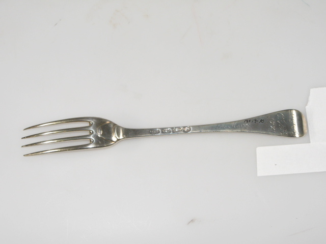 Tafelvork. Steel met middenribbe en omhoog gebogen ronde kop, aan de achterzijde dubbel Amsterdams lof. Op onderzijde steel is een monogram gegraveerd met initialen: D.I.A./ O.V.H./, de afkorting van Diaconie Oude Vrouwenhuis, alsmede een naam van diaken of diaconesse en het jaar van aantreden in die functie.