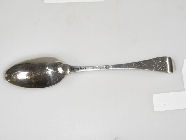Tafellepel. Steel met middenribbe en omhoog gebogen ronde kop, aan de achterzijde dubbel Amsterdams lof; ovale lepelbak, overwegend puntig. Op onderzijde steel is een monogram gegraveerd met initialen: D.I.A./ O.V.H./, de afkorting van Diaconie Oude Vrouwenhuis, alsmede een naam van diaken of diaconesse en het jaar van aantreden in die functie.