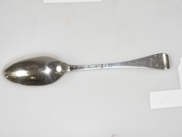Tafellepel. Steel met middenribbe en omhoog gebogen ronde kop, aan de achterzijde dubbel Amsterdams lof; ovale lepelbak, overwegend puntig. Op onderzijde steel is een monogram gegraveerd met initialen: D.I.A./ O.V.H./, de afkorting van Diaconie Oude Vrouwenhuis, alsmede een naam van diaken of diaconesse en het jaar van aantreden in die functie.