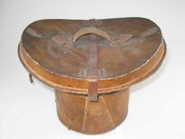 Unieke, bijzondere doos in de vorm van de hoed, met voering en extra vakje in deksel. Een stukje riem mist, verder in goede staat.