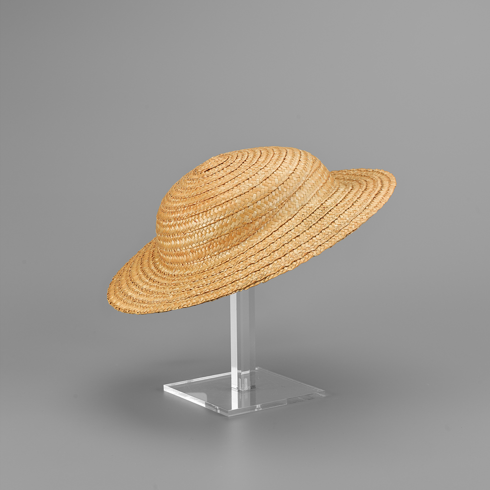 Zomerhoed van naturelkleurig gevlochten stro. De hoed werd gedragen als zonnehoed.- Trefwoorden