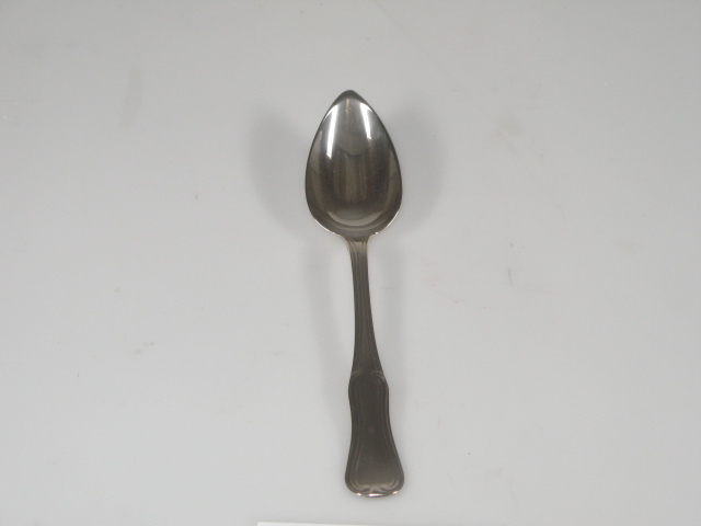 Dessertlepel met gebogen spadelsteel, ronde steelkop en puntig ovale lepelbak. Voorzijde spadel met opstaande filetranden, beginnend en eindigend in oogjes. Voorzijde voorts met dubbele inwaartse filet zonder knopje, de achterzijde met een enkel inwaartse filet met bijpassend lof.