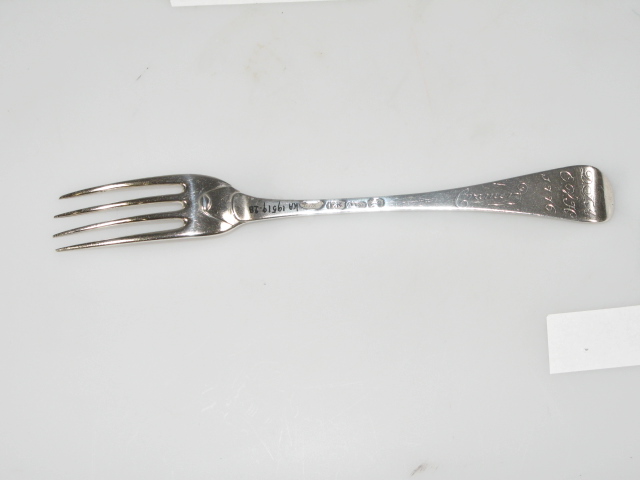Tafelvork. Steel met middenribbe en omhoog gebogen ronde kop, aan de achterzijde dubbel Amsterdams lof. Op onderzijde steel is een monogram gegraveerd met initialen: D.I.A./ O.V.H./, de afkorting van Diaconie Oude Vrouwenhuis, alsmede een naam van diaken of diaconesse en het jaar van aantreden in die functie.
