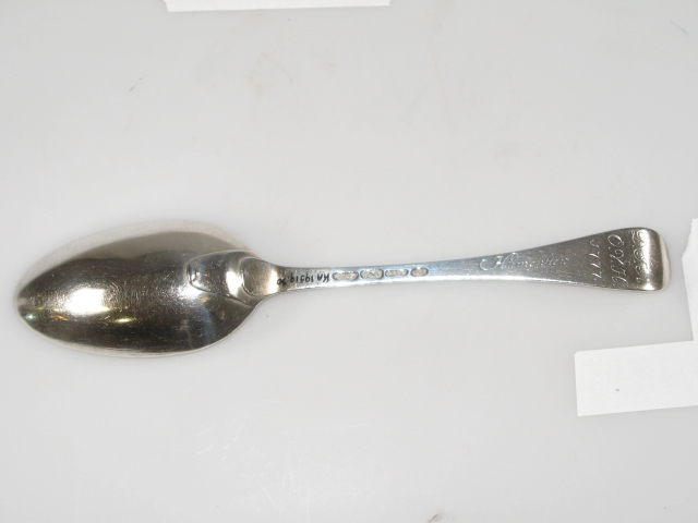 Tafellepel. Steel met middenribbe en omhoog gebogen ronde kop, aan de achterzijde dubbel Amsterdams lof; ovale lepelbak, overwegend puntig. Op onderzijde steel is een monogram gegraveerd met initialen: D.I.A./ O.V.H./, de afkorting van Diaconie Oude Vrouwenhuis, alsmede een naam van diaken of diaconesse en het jaar van aantreden in die functie.