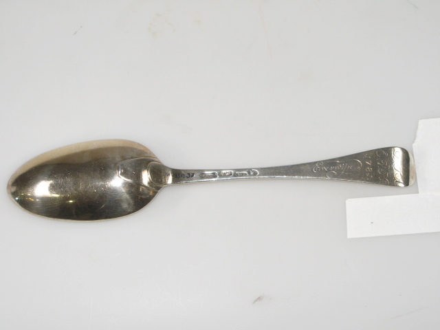 Tafellepel. Steel met middenribbe en omhoog gebogen ronde kop, aan de achterzijde dubbel Amsterdams lof; ovale lepelbak, overwegend puntig. Op onderzijde steel is een monogram gegraveerd met initialen: D.I.A./ O.V.H./, de afkorting van Diaconie Oude Vrouwenhuis, alsmede een naam van diaken of diaconesse en het jaar van aantreden in die functie.