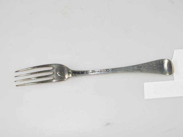 Tafelvork. Steel met middenribbe en omhoog gebogen ronde kop, aan de achterzijde dubbel Amsterdams lof. Op onderzijde steel is een monogram gegraveerd met initialen: D.I.A./ O.V.H./, de afkorting van Diaconie Oude Vrouwenhuis, alsmede een naam van diaken of diaconesse en het jaar van aantreden in die functie.
