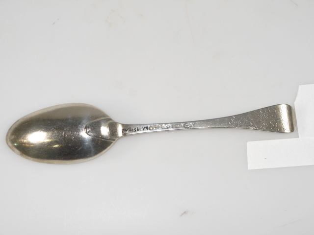 Tafellepel. Steel met middenribbe en omhoog gebogen ronde kop, aan de achterzijde dubbel Amsterdams lof; ovale lepelbak, overwegend puntig. Op onderzijde steel is een monogram gegraveerd met initialen: D.I.A./ O.V.H./, de afkorting van Diaconie Oude Vrouwenhuis, alsmede een naam van diaken of diaconesse en het jaar van aantreden in die functie.