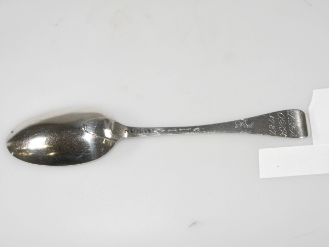 Tafellepel. Steel met middenribbe en omhoog gebogen ronde kop, aan de achterzijde dubbel Amsterdams lof; ovale lepelbak, overwegend puntig. Op onderzijde steel is een monogram gegraveerd met initialen: D.I.A./ O.V.H./, de afkorting van Diaconie Oude Vrouwenhuis, alsmede een naam van diaken of diaconesse en het jaar van aantreden in die functie.