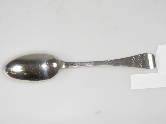 Tafellepel. Steel met middenribbe en omhoog gebogen ronde kop, aan de achterzijde dubbel Amsterdams lof; ovale lepelbak, overwegend puntig. Op onderzijde steel is een monogram gegraveerd met initialen: D.I.A./ O.V.H./, de afkorting van Diaconie Oude Vrouwenhuis, alsmede een naam van diaken of diaconesse en het jaar van aantreden in die functie.