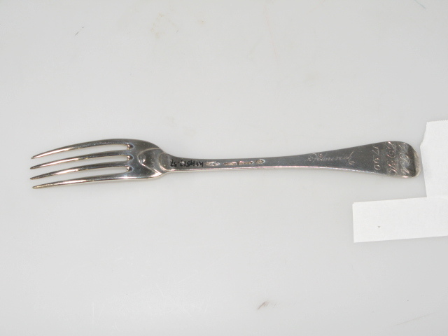 Tafelvork. Steel met middenribbe en omhoog gebogen ronde kop, aan de achterzijde dubbel Amsterdams lof. Op onderzijde steel is een monogram gegraveerd met initialen: D.I.A./ O.V.H./, de afkorting van Diaconie Oude Vrouwenhuis, alsmede een naam van diaken of diaconesse en het jaar van aantreden in die functie.