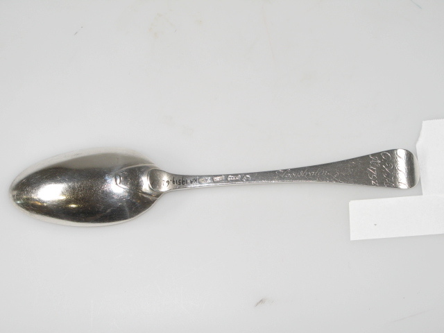 Tafellepel. Steel met middenribbe en omhoog gebogen ronde kop, aan de achterzijde dubbel Amsterdams lof; ovale lepelbak, overwegend puntig. Op onderzijde steel is een monogram gegraveerd met initialen: D.I.A./ O.V.H./, de afkorting van Diaconie Oude Vrouwenhuis, alsmede een naam van diaken of diaconesse en het jaar van aantreden in die functie.