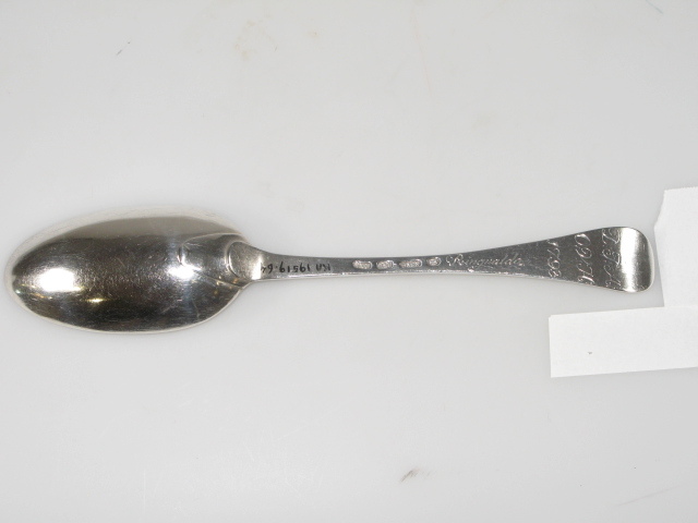 Tafellepel. Steel met middenribbe en omhoog gebogen ronde kop, aan de achterzijde dubbel Amsterdams lof; ovale lepelbak, overwegend puntig. Op onderzijde steel is een monogram gegraveerd met initialen: D.I.A./ O.V.H./, de afkorting van Diaconie Oude Vrouwenhuis, alsmede een naam van diaken of diaconesse en het jaar van aantreden in die functie.
