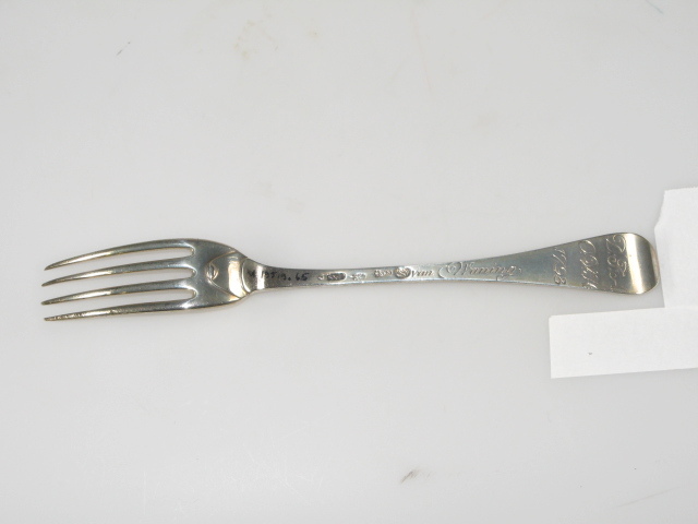 Tafelvork. Steel met middenribbe en omhoog gebogen ronde kop, aan de achterzijde dubbel Amsterdams lof. Op onderzijde steel is een monogram gegraveerd met initialen: D.I.A./ O.V.H./, de afkorting van Diaconie Oude Vrouwenhuis, alsmede een naam van diaken of diaconesse en het jaar van aantreden in die functie.
