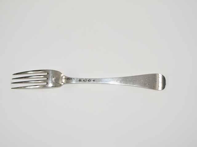 Tafellvork uit de negentiende eeuw, steel met middenribbe en omhoog gebogen ronde kop, aan de achterzijde dubbel Amsterdams lof. Op onderzijde steel is een monogram gegraveerd met de initialen: D.I.A./ O.V.H./, de afkorting van Diaconie Oude Vrouwenhuis, alsmede de naam van diaconesse en het jaar van aantreden in die functie.