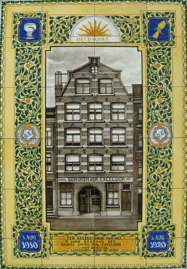 Een tegeltableau is een vlak, bestaande uit meerdere aardewerken tegels, die door een schildering één voorstelling vormen. Tegeltableaus werden vanaf de zeventiende eeuw populair, omdat ze zowel decoratief als functioneel waren. Ze boden uitkomst tegen vocht, waar huisjes langs grachten en kanalen nogal eens last van hadden, en waren gemakkelijk schoon te houden. Daarnaast zorgden de uit Italië afkomstige vormen, kleuren en motieven voor een vrolijke aanblik rond de haard of in de gang. In de periode van de Jugendstil (ca. 1900) leefde de aandacht voor tegeltableaus opnieuw op. Families en bedrijven die het zich konden veroorloven, lieten wanden, gevels en portieken versieren met tegeltableaus in Art Nouveau stijl. Ook voor jubilea en andere feestelijke gelegenheden werden soms tegeltableaus vervaardigd. Dit tegeltableau is vervaardigd ter gelegenheid van het tienjarig bestaan van de Geheelonthouders Vereniging Excelsior in augustus 1920. ( Sarah Remmerts de Vries)