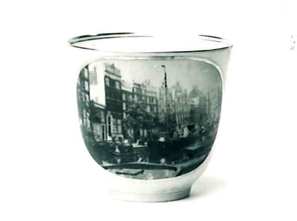 Kop is omgekeerd convex-conisch gevormd, op standring. Met gegolfd oor, zwart met gouden biesje. Op voorzijde van wand een afbeelding van het Huis met de hoofden aan de Keizersgracht. Op onderzijde in bovenglazuur, in zwart, het opschrift: 't Huis met de Hoofden. Ronde schotel met schuin oplopende rand, op standring. Gouden bies rond middengedeelte. Slijtage aan roze fonds.