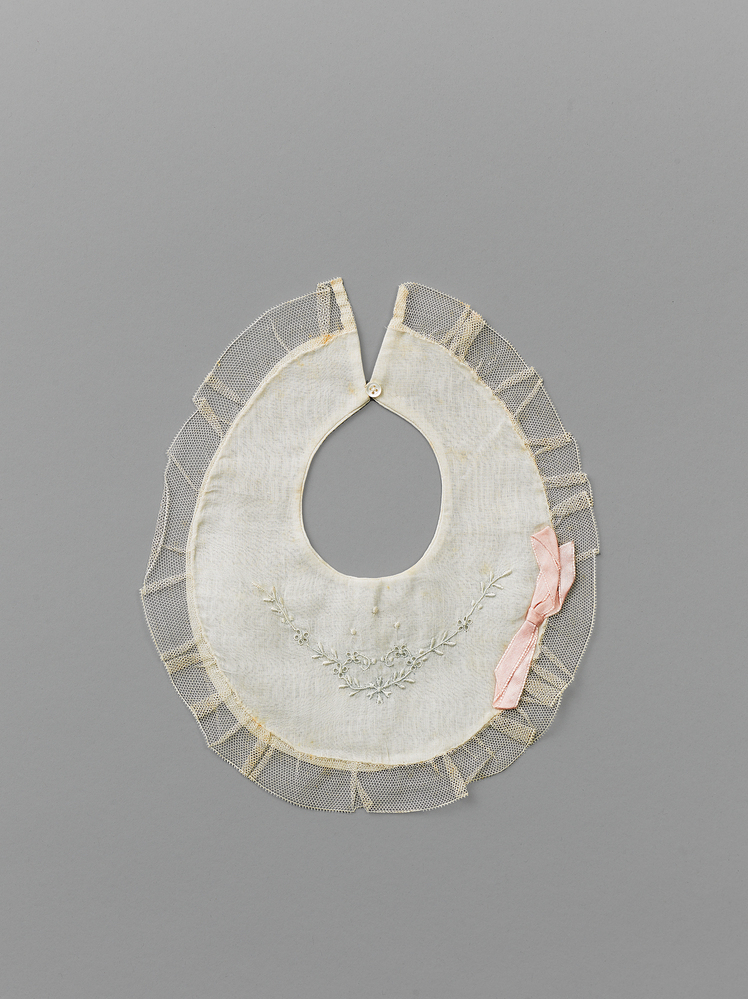Slab, rond model. Drie lagen wit dun katoen, waarvan bovenste laag is geborduurd met licht blauw en wit borduurwerk in de vorm van bloemmotief. Afgewerkt met gerimpelde strook tuleband. Als versiering een opgenaaide roze strik van smal satijnband. Sluiting met paarlemoeren knoopje middenachter.