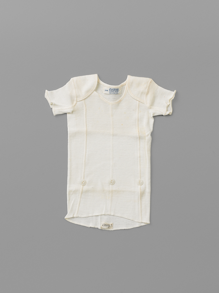 Hemdje van naturelkleurig tricot. Ronde hals, korte mouw. Op taillehoogte drie knopen waaraan het broekje geknoopt wordt.