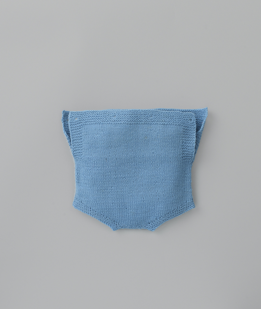 Hemelsblauw wollen broekje, gebreid in gerstekorrel. Rondom, aan bovenzijde zes knoopsgaten, waarmee het aan (knopen van) truitje bevestigd kan worden.