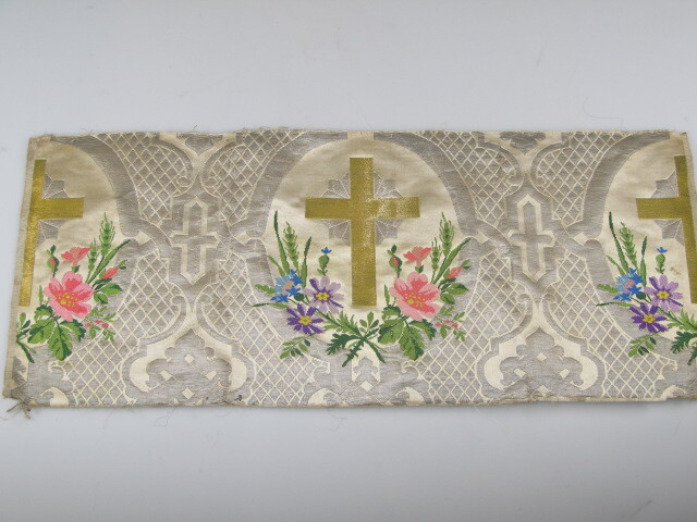 Lapje zijde, met gouden kruisen en bloemen in verschillende kleuren.- Trefwoorden