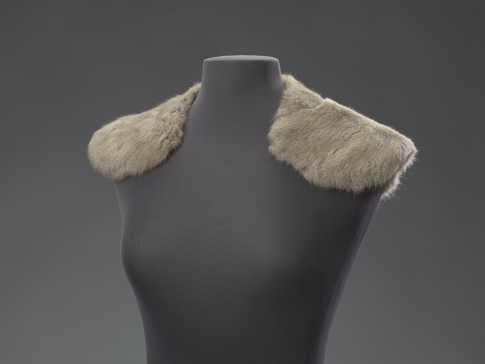 Rondvallende kraag van lichtgrijs bont, mogelijk petit gris.- Trefwoorden