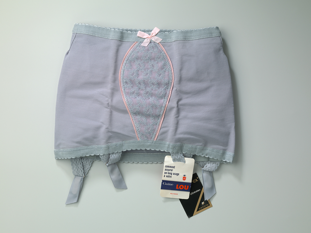 De step-in van lichtgrijze en roze polyamide/lycra is nooit gedragen. De papieren labels zitten er nog aan en de bijbehorende verpakking is bewaard gebleven. Op de rechthoekige doos staat een afbeelding van een jonge vrouw met de bijbehorende lichtgrijze/roze B.H. aan. Daaronder de tekst: 'LOU BOUTIQUE'. Aan de onderzijde de opening met op de flap: 'LOU TAILLE 100 / COLORIS GRIS / RÉF 1056 / PRIX.' ( Judith van Amelsvoort)