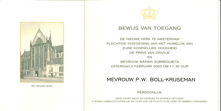 - toegangsbewijs, gebouw, Nieuwe Kerk, huwelijk, Nieuwe Kerk, Koninklijk Huis, Koning der Nederlanden Willem-Alexander Claus George Ferdinand, Prins van Oranje-Nassau, Jonkheer van Amsberg, prinses der Nederlanden Máxima, prinses van Oranje-Nassau, Carel A. ter Linden, Pauline W. Kruseman