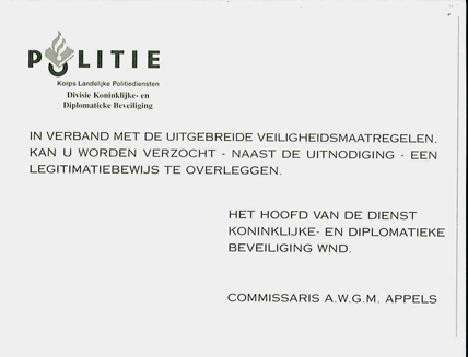 - Politieoproep om legitimatie mee te nemen naar de huwelijksinzegening van Prins Willem-Alexander en Máxima Zorreguieta op 2002-02-02 in de Nieuwe Kerk, 2002