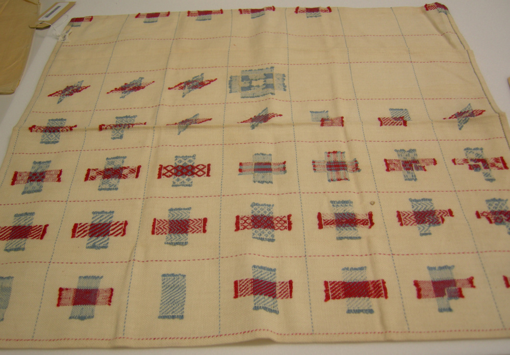 Lap van wit stramienkatoen en rood en blauw borduurgaren, onderverdeeld in 49 vierkantenb met verschillende soorten stoppen en doorstoppen. Links boven linnen bandje, in rode kruissteek: C. Blankenburg.