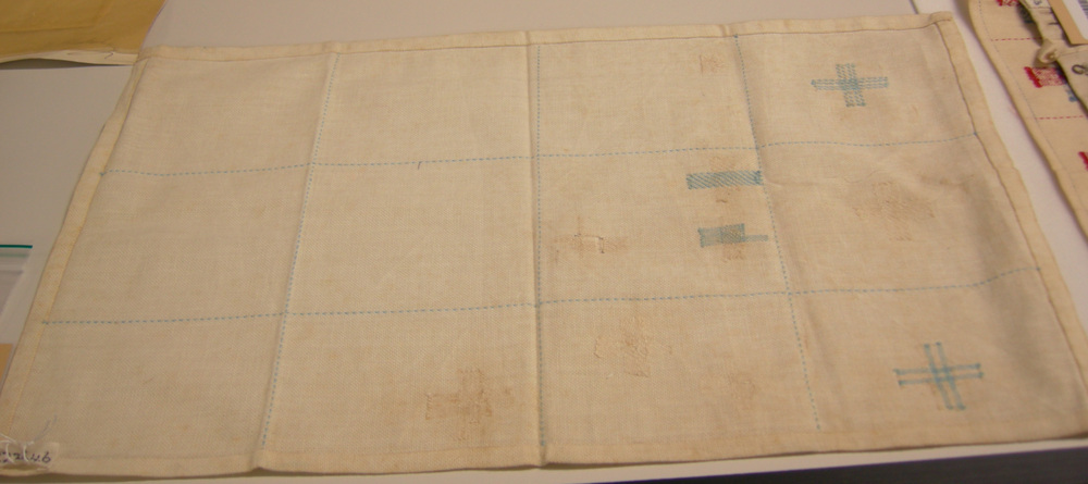 Kleine Erna is ongetwijfeld vol ijver begonnen aan deze stoplap. Nadat ze haar doek omgezoomd heeft, heeft ze met rijgsteekjes de doek ingedeeld in vakjes van ongeveer 8 bij 10 centimeter. De leesrichting van de doek is onduidelijk. Waarschijnlijk is ze links boven begonnen. Ze vult zeven vakken met soms meerdere kruis- en winkelhaakstoppen, die zowel linkshoekig als rechtshoekig zijn. Op de derde rij is de laatste stop gelegd. Ze werkt met lichtblauw en beige garen. Erna is dapper; ze durft het aan om zes stoppen in dezelfde kleur als de ondergrond uit te werken. De meisjes gebruikten meestal gekleurd garen om beter zicht te hebben op de patronen die onder hun handen ontstonden. Hun strenge handwerkjuffrouw zag de fouten bovendien eerder. Kleur-op-kleurstoppen was niet voor iedereen weggelegd. Voor Erna wel.