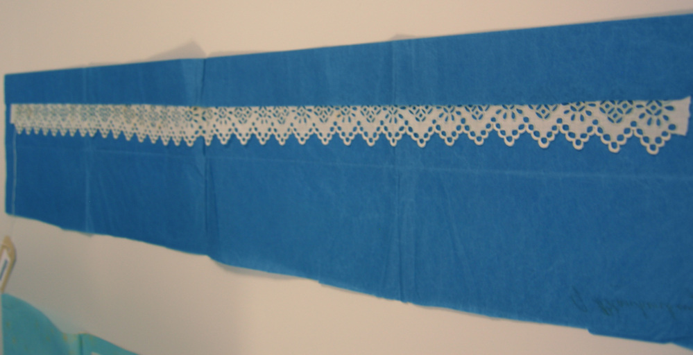 Strook Engels borduurwerk genaaid op blauw papier.- Trefwoorden