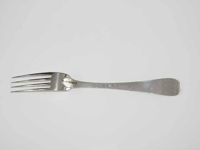 Tafellvork uit de negentiende eeuw, steel met middenribbe en omhoog gebogen ronde kop, aan de achterzijde dubbel Amsterdams lof. Op onderzijde steel is een monogram gegraveerd met de initialen: D.I.A./ O.V.H./, de afkorting van Diaconie Oude Vrouwenhuis, alsmede de naam van diaconesse en het jaar van aantreden in die functie.