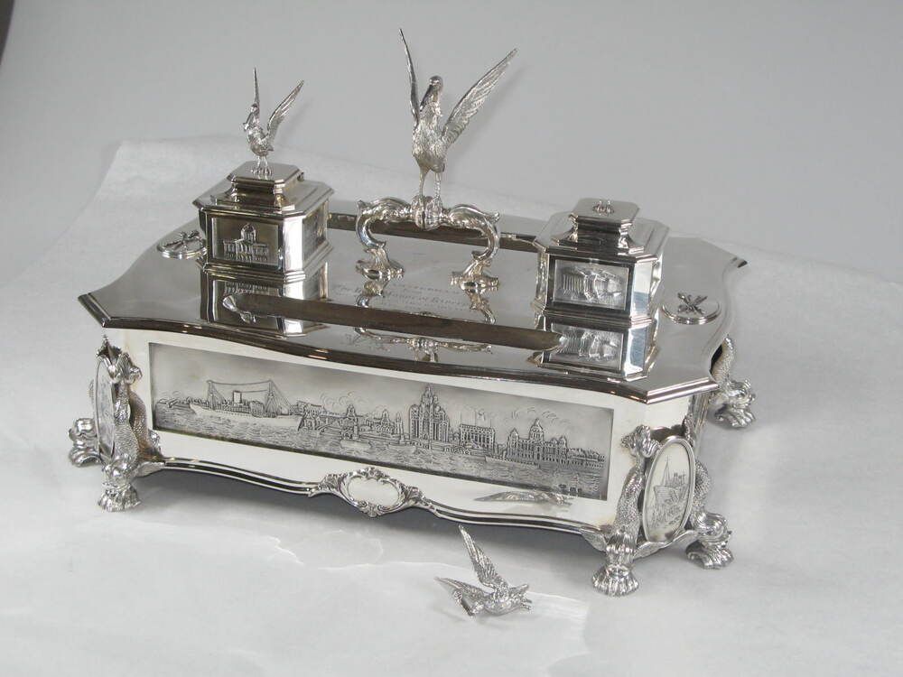 - Zilveren inktstel in étui en bijbehorende oorkonde in koker (inktstel), 1930