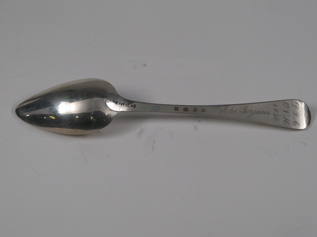 Tafellepel uit de negentiende eeuw, steel met middenribbe en omhoog gebogen ronde kop, aan de achterzijde dubbel Amsterdams lof, ovale lepelbak. Op onderzijde steel is een monogram gegraveerd met de initialen: D.I.A./ O.V.H./, de afkorting van Diaconie Oude Vrouwenhuis, alsmede de namen van de diakenen en diaconessen en het jaar van hun aantreden in die functie.