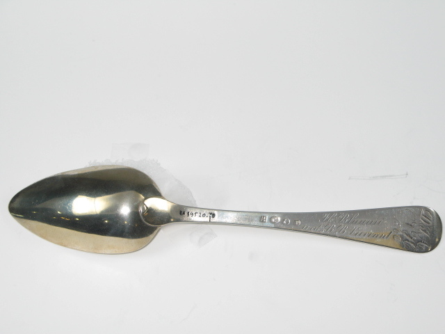 Tafellepel uit de negentiende eeuw, steel met middenribbe en omhoog gebogen ronde kop, aan de achterzijde dubbel Amsterdams lof, ovale lepelbak. Op onderzijde steel is een monogram gegraveerd met de initialen: D.I.A./ O.V.H./, de afkorting van Diaconie Oude Vrouwenhuis, alsmede de namen van de diakenen en diaconessen en het jaar van hun aantreden in die functie.